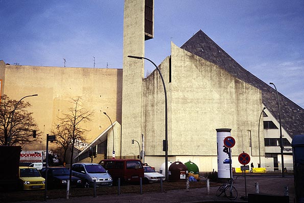 Heute gehört es zum Alltäglichen, dass Brandwände, vor Allem in Mitte und im Osten, ziemlich rasch verschwinden. Und plötzlich überlegt man, kann man sich überlegen, schliesslich hat nicht jede breite Strasse der Stadt die weiten Radien von Autobahnzubringern nötig, diese Kirche wieder zu erweitern. Es könnte ja sein, dass ihr Innenraum... gut, Kirchenschiffvergrösserungen sind selten heute, doch wer weiss, was kommt, und man kann sich eine Veränderung vorstellen, dafür steht dieses Beispiel. Ich möchte vermuten, dass die Architekten gedacht haben, irgendwann wird vielleicht eine andere Zeit sein und dann reisst man das Ding wieder ab. Ich frage mich, ob es für die Ewigkeit gebaut, geplant wurde. Das ist eine Eigenschaft, die mir an dieser Architektur auch gefällt.