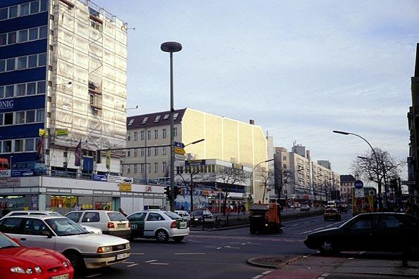 An der Dominicusstrasse hat man Wohnungen in grossen Stücken geplant, die Strasse verbreitert. Im Vordergrund ein Gebäude der sechziger Jahre, im Hintergrund ein Wohnkomplex der siebziger Jahre. Dazwischen, vor der dominanten Brandwand eines Gründerzeithauses, blieb ein schmaler Zwickel übrig.
