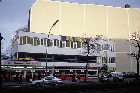 Es ist eine Trouvaille. Schade, dass da oben ein Sonnenstudio ist, das liesse sich auch im Keller unterbringen, es wäre die Lage für ein phantastisches Büro mit Parkdeckanteil, einem kontinuierlichen Band weiss gestrichener Holzfenster, einem Eingangsbereich Tokioter Art. Die rechte Gebäudeseite ist nur wenige Fensterflügel breit, und auf dem Rest des Grundstücks hat noch genau ein Auto Platz. Hier ein Lieferwagen. Man sieht das Refugium der letzten treuen Mieter von "Sun Vision", "Asia Imbiss" und "Knüller Kiste", und auf den zweiten Blick Architektur, in die man sich nicht bloss einmieten könnte, sondern, gerade scheint die Abendsonne mit einem Licht wie bei Edward Hopper, deren Lage man auszeichnen, die man erweitern, überformen könnte. Sich der Architektur mit architektonischen Mitteln annehmen.