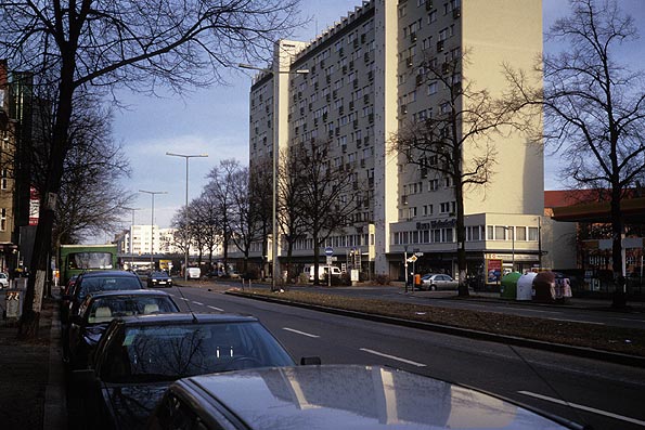 Der Architekt hat das Haus nicht wie üblich ost-west-orientiert, sondern hat es um ungefähr 45 Grad gedreht, so dass man eigentlich von einer Nordwest-Südost-Orientierung sprechen müsste. (Es ist schon bezeichnend, dass es das Wort nicht gibt). Das hat zur Folge, es ist Winter, die Sonne ist am Untergehen, man sieht die langen Schatten, dass die Wohnungen immer noch keine Sonne haben. Das Gebäude mag im Sinne optimal ausgerichteter Wohnungsgrundrisse, wie sie in der Zeit, in der es gebaut wurde, state of the art waren, in seiner wesentlichsten Eigenschaft als dysfunktional gegolten haben, aber heute kann es mit seiner unorthodoxen Stellung Beispiel sein, eine Strategie aufzeigen.