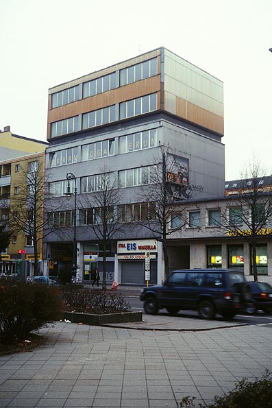Wir sind jetzt an der Ecke Gneisenaustrasse-Mehringdamm. Das ist ein weiteres Haus, das ich ganz gerne hab. Es ist in keinem Architekturführer, auch wenn ich den Architekten gerne drin finden würde. Vermutlich ist es in den sechziger Jahren gebaut worden. Ein Nachbargebäude ist sogar nur zweigeschossig. Man könnte hier eigentlich von eklektischer Carambole-Architektur sprechen. Ein Haus, das so tut, als sei es aufgestockt worden. Eine Entwurfshaltung, die zur Kenntnis nimmt, dass eh alle Häuser an der Strasse wie Birnen und Äpfel, Kraut und Rüben, nicht zusammenpassen, und so aus einem einzigen Haus schon zwei Teile macht, die nie Eins sein wollen.