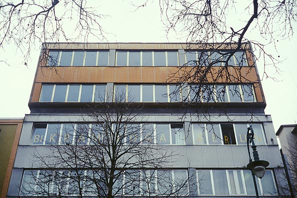 Ich weiss nicht, ob diese wahnsinnig widerliche, schäbige, piefige Blechverkleidung, die da oben auch noch gestrichen ist, wo man die Farbe nicht einmal eloxiert oder einbrennlackiert hat, nachträglich, anlässlich einer Aussenisolation aufgebracht hat, oder ob sie von Anfang an Teil der Architektur war. Oben sind die Profile bronzen, unten aluminiumfarben.