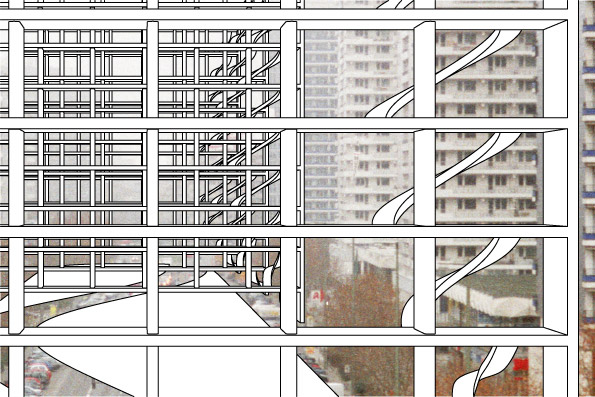 Auch hier sind wir im städtischen Raum. Das ist noch einmal ein Ausschnitt der eingangs gezeigten Collage. Aus räumlichen Überlegungen ging es auch darum, die Gebäude transparent zu halten. So beträgt die Gebäudetiefe nur sieben Meter. Die rohe Geschosshöhe lädt geradezu ein, den Innenraum auch durch Zwischengeschosse weiter auszunutzen, gewissermassen mittels architektonischer Hochbetten. Die oft gefürchteten Probleme, die sich ergeben, wenn Bewohner das Bedürfnis haben, ihren Balkon mit Schilfmatten und anderen Dingen gegen den Einblick von aussen zu schützen, sind nicht zu erwarten, weil die Höhe einer Schilfmatte sich im Verhältnis zur Raumhöhe hier in Grenzen hält. Wenn jemand nicht möchte, das abends in seine Wohnung reingeguckt wird, dann genügt ein zwei Meter hoher Vorhang, der die Transparenz des ganzen Gebäudes noch nicht wirklich aufheben kann. Natürlich ist sie eingeschränkt durch die Art der Verglasung, durch Sonnenschutz und was noch an Zusatzerschliessung, Installationen und Aufbauten durch den Ausbau hinzukommt.